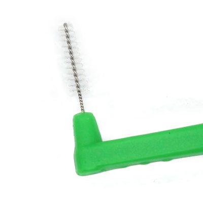 מברשת לניקוי בעלת ידית ארוכה, צוואר צר וראש מוטה בזווית המאפשרת גישה נוחה וקלה למרווחים בין השיניים.