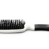 מברשת שיער בעלת עיצוב מעוקל, בגוונים שחור, לבן וורוד לסירוק והברשת השיער.